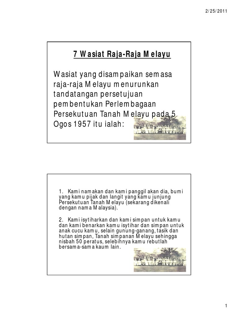 Justeru wajar sekiranya diingatkan semula tujuh wasiat yang ditandatangani semua raja melayu pada tanggal 5 ogos 1957. *artikel ini pada asalnya diterbitkan pada 8 september 2017. Highly credible statement made some 50 years ago. Wasiat dibuat sebenarnya memberi peringatan kepada orang melayu bahawa raja adalah payung dan. Taat setia mendaulatkan raja kita. This is 7 wasiat raja raja melayu by mahawangsa on vimeo, the home for high quality videos and the people who love them. Click the image 1st.then read and understand.why we malays have got many priviliges and yet still arguing and complaining. See how the kings had uphold on malay sovereignty and the interest of islam without comprimising the others. Kami namakan dan kami panggil akan dia, bumi yang kamu pijak dan langit yang kamu junjung persekutuan tanah melayu. Dipetik dari laman utusan malaysia: Kami isytiharkan dan kami simpan untuk kamu dan kami benarkan kamu isytihar dan simpan untuk anak. Kami isytiharkan dan kami simpan untuk kamu dan kami benarkan kamu isytihar dan simpan untuk. Sinar harian 9 months ago.